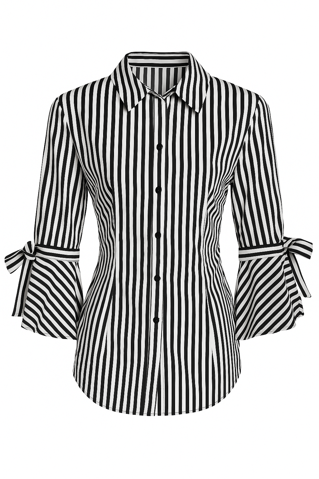 Make a bold statement with this black and white vertical striped blouse, designed for both elegance and edge. Featuring a flattering tailored fit, button-down front, and standout three-quarter bell sleeves with chic bow tie accents, this top is perfect for work or weekend wear.