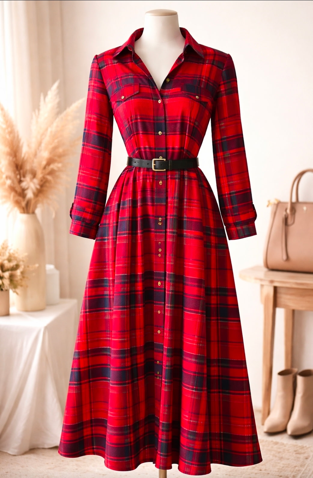 Effortlessly timeless with a touch of cozy charm, this red plaid shirt dress is a wardrobe staple for cooler seasons. Designed with a flattering button-down front and a softly structured silhouette, this dress cinches beautifully at the waist with a removable black belt for a defined, feminine fit. The long sleeves and midi length offer…